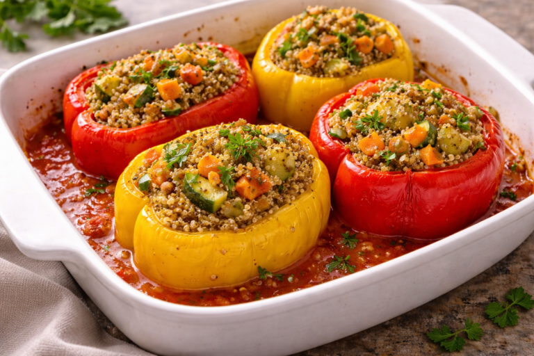 Pimientos rellenos de quinoa y verduras con salsa de tomate casera